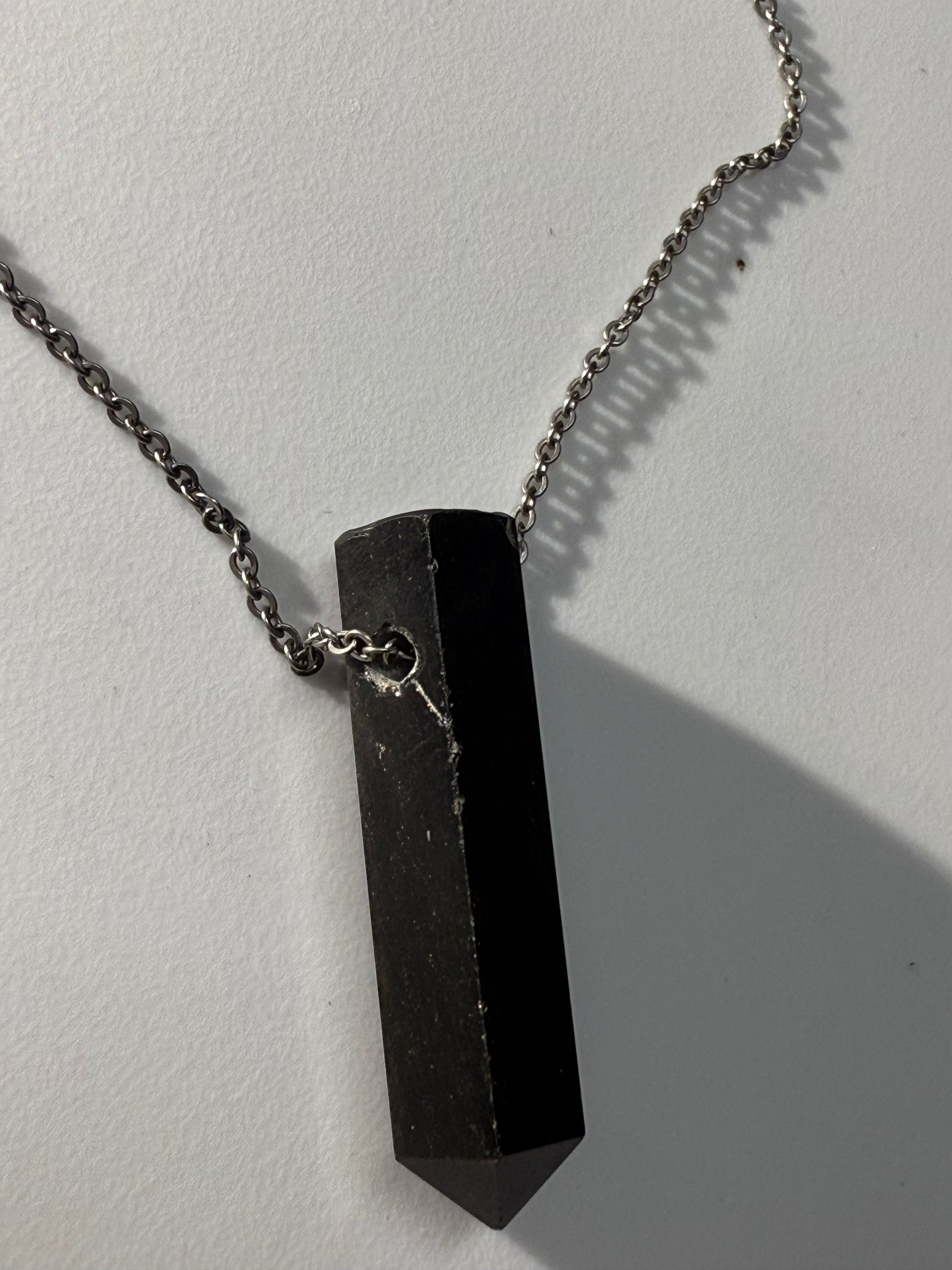 Hermoso collar con lápiz de obsidiana negra auténtica. Esta piedra volcánica de color negro profundo es conocida por sus poderosas propiedades protectoras y de absorción de energías negativas. El lápiz de cristal cuelga de una cadena resistente, creando una pieza de joyería única que combina belleza natural con energía espiritual.